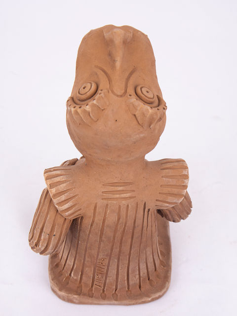 Escultura em barro moldada artesanalmente, marcada por textura e expressão natural.